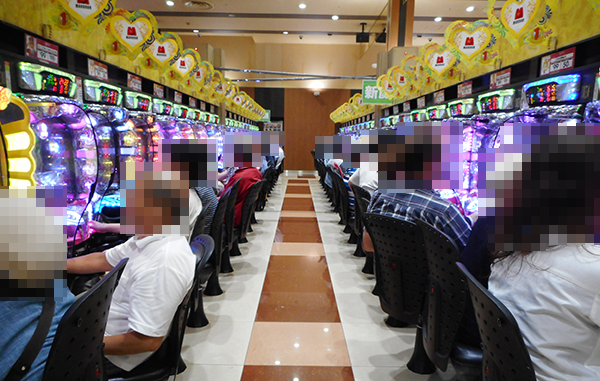 14時をまわった頃になっても、4円パチンコでは「CRリング 終焉ノ刻」と海物語シリーズが盛況。シマ内に広がる華やかな光景は、満足度の高さをあらわしているようであった。