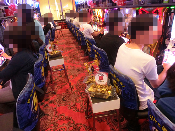 20円パチスロの様子をうかがうと、「バジリスク~甲賀忍法帖~絆」や「ミリオンゴッド-神々の凱旋-」などが活況。機種のポテンシャルを上手く引き出しているプレイヤーが続出し、ひときわ注目を集めていた。