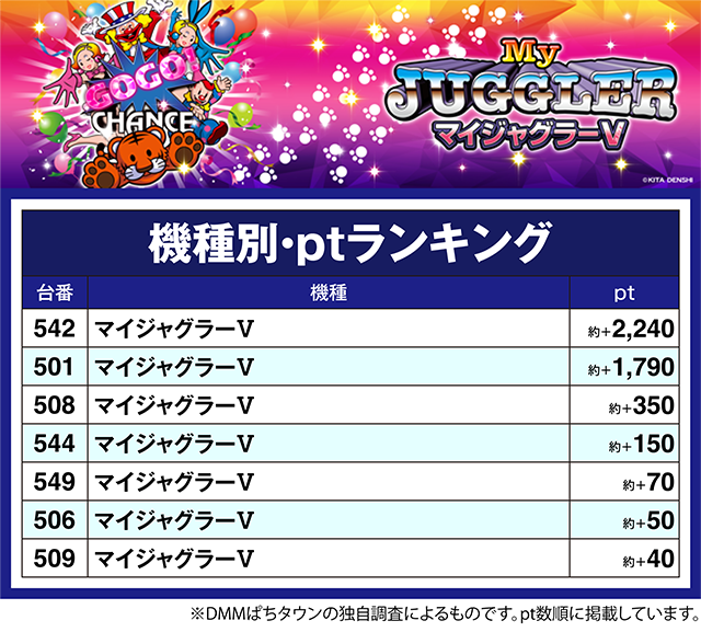 「ゴーゴージャグラー3」では、569番台と570番台が約+1,100ptを上回った。