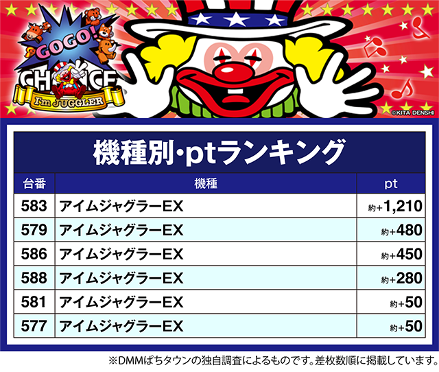 「アイムジャグラーEX」は6台がプラスとなり、583番台が約+1,210ptを記録。