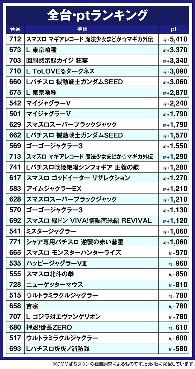 最新機種も活気があり、「Lパチスロ 機動戦士ガンダムSEED」の660番台が約+3,060ptを記録した。
