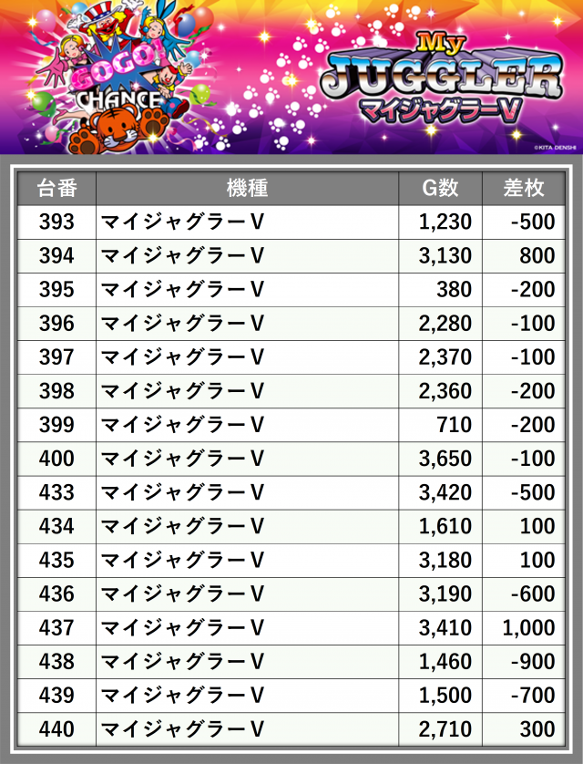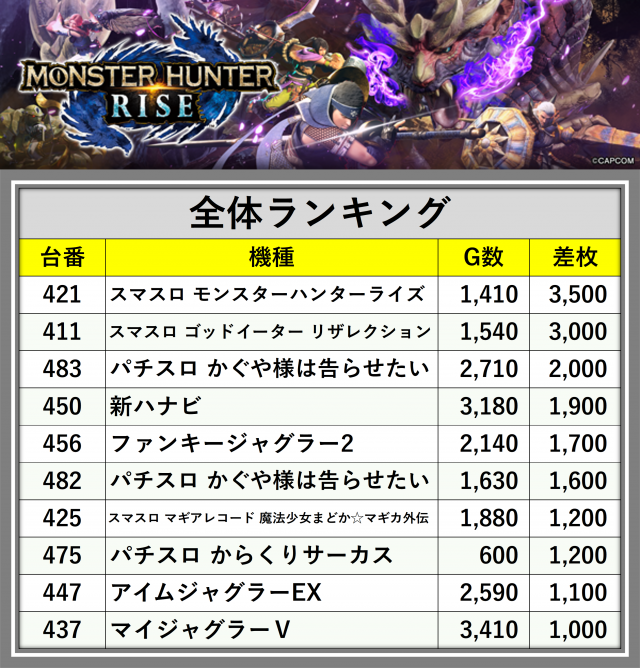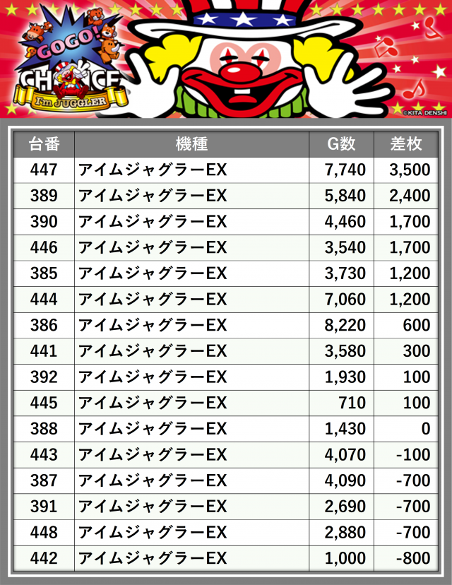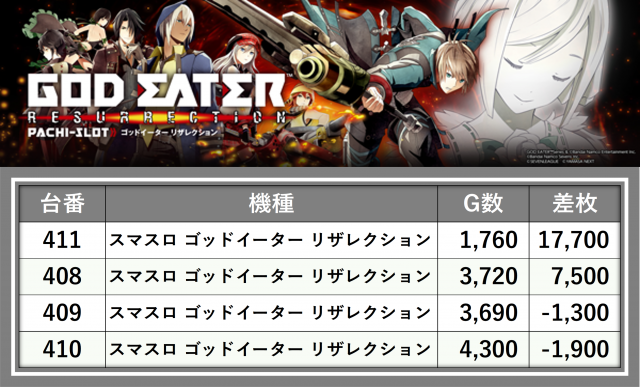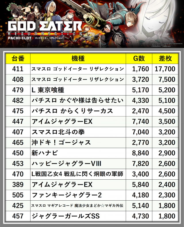 厳選された取材対象機種をはじめ、その他スロット全体から好記録が飛び出した!プレイヤーが楽しんだ1日を下記データにて振り返ってみて欲しい。