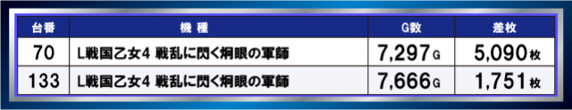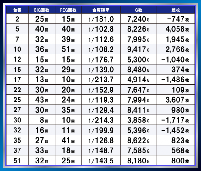 差枚+1000枚超の台が複数並び、粘りを感じさせるデータが印象的だった。