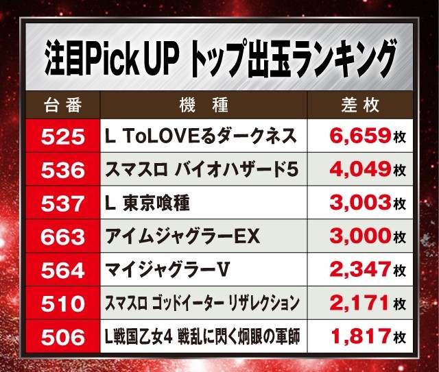 この日の店内状況をチェックすると、人気のスマスロを中心に多数の好調台を確認。そんな中、『L ToLOVEるダークネス』が6,659枚を叩き出しランキングトップに。次いで、『スマスロ バイオハザード5』から+4,049枚、『L 東京喰種』から+3,003枚が確認されている。