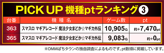 「スマスロ シャーマンキング」の86番台と「スマスロ マギアレコード 魔法少女まどか☆マギカ外伝」の363番台も約+7,400ptオーバー。