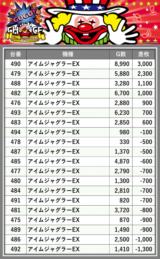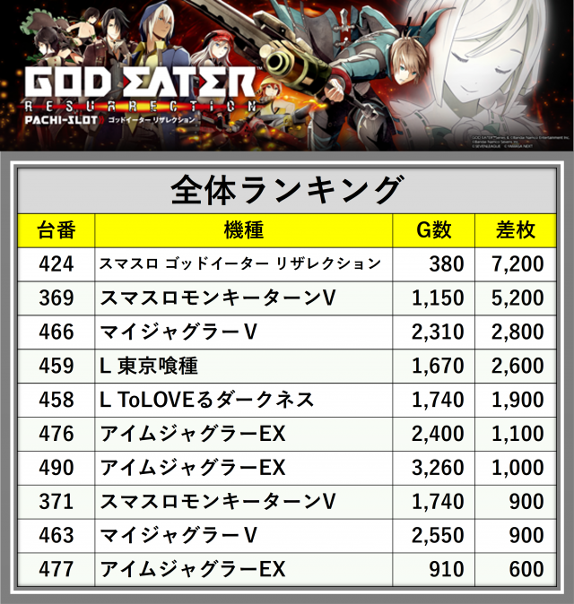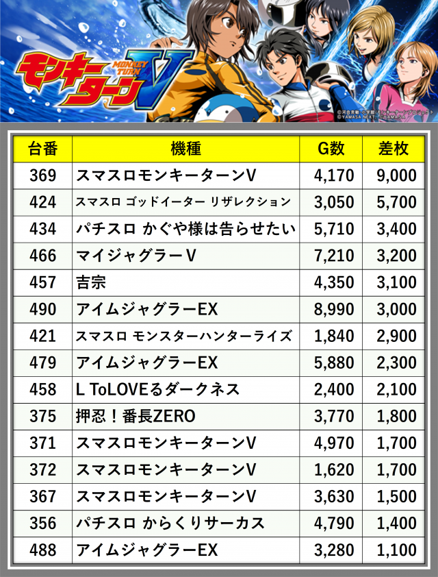 ※差枚数順に掲載しています