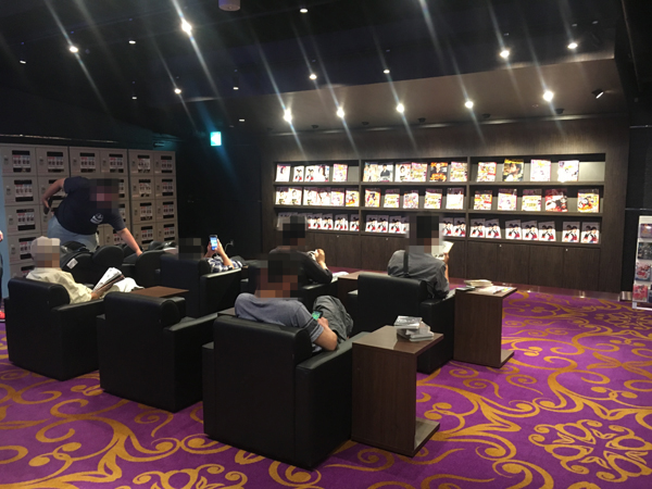 店内は、清潔であると同時に設備が大きく空間が広いので開放感がある。マッサージチェアを完備した休憩スペースは、雑誌や漫画本も充実。さらにタブレットも使用可能と至れり尽くせりだ。