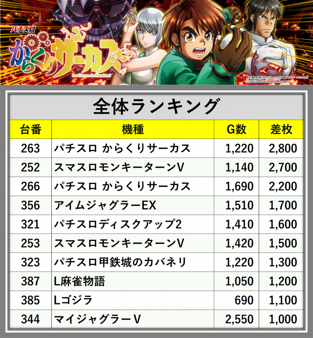 厳選された取材対象機種をはじめ、その他スロット全体から好記録が飛び出した!プレイヤーが楽しんだ1日を下記データにて振り返ってみて欲しい。