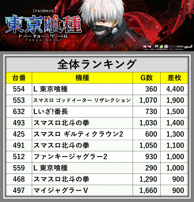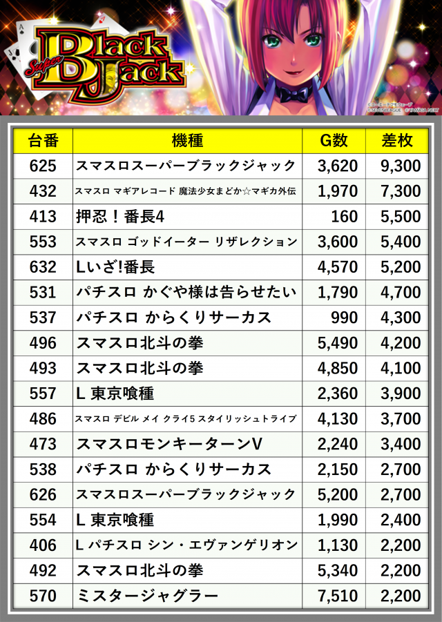 ※差枚数順に掲載しています