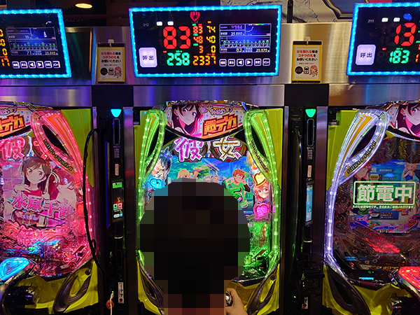 14時半ごろの4.34円パチンコでは、「e 東京喰種」や「eフィーバー彼女、お借りします」でプレイヤーが華麗なパフォーマンスを披露。微笑ましいシーンを随所で目にしている。