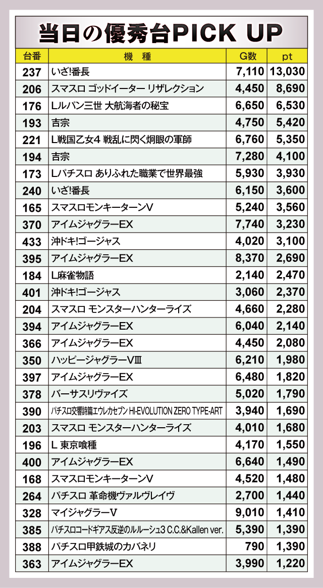『いざ!番長』237番台が+13,030ptと、ひときわ輝く成績を残している。そして『スマスロ ゴッドイーター リザレクション』206番台が+8,690pt、『Lルパン三世 大航海者の秘宝』176番台が+6,530ptとつづく。ほかにも『吉宗』193番台の+5,420pt、『L戦国乙女4 戦乱に閃く炯眼の軍師』221番台の+5,350ptなどなど、様々なタイプの機種の高ptが並んでいた。