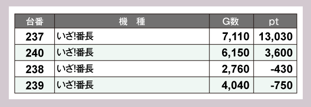 1万pt達成台があらわれた『いざ!番長』は、240番台も+3,600ptと見事なptを叩きだした。さらに『Lルパン三世 大航海者の秘宝』と『吉宗』からも、それぞれ6,000pt・5,000ptオーバーの優秀台が飛びだしている。