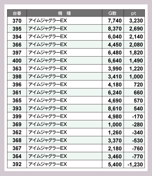 19台設置の『アイムジャグラーEX』は12台がプラスptと、バツグンの安定感を示している。