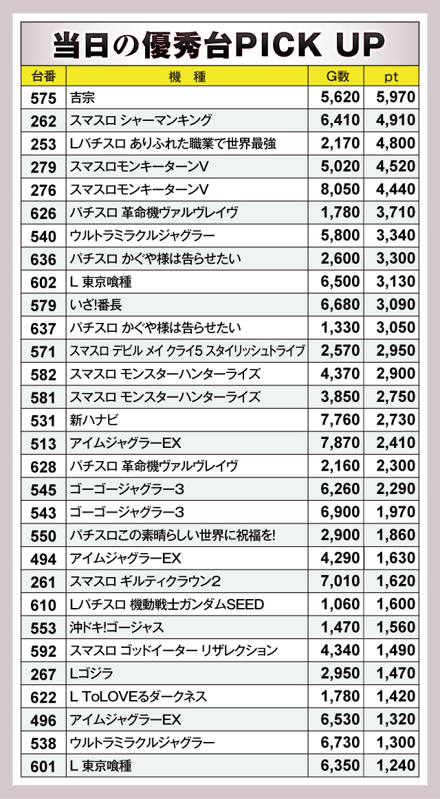 この日、とくに目立っていたのはスマスロコーナー。『吉宗』575番台が+5,970pt、『スマスロ シャーマンキング』262番台が+4,910pt、『Lパチスロ ありふれた職業で世界最強』253番台が+4,800ptと見事な成績を残している。他にも『スマスロモンキーターンV』279番台の+4,520ptや276番台の+4,440ptなど、華やかなデータが並んでいた。