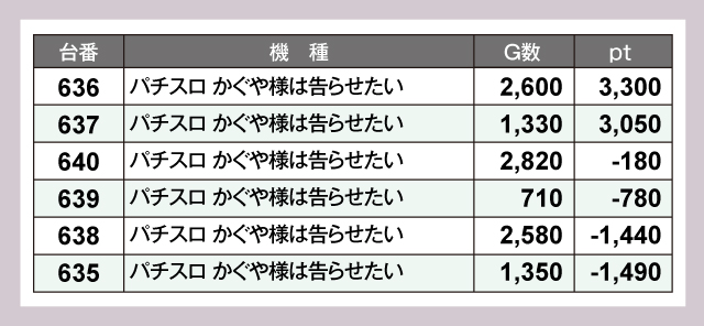 『パチスロ かぐや様は告らせたい』は6台中2台がプラスptで、その2台の活躍によりトータルptもプラスとなっている。