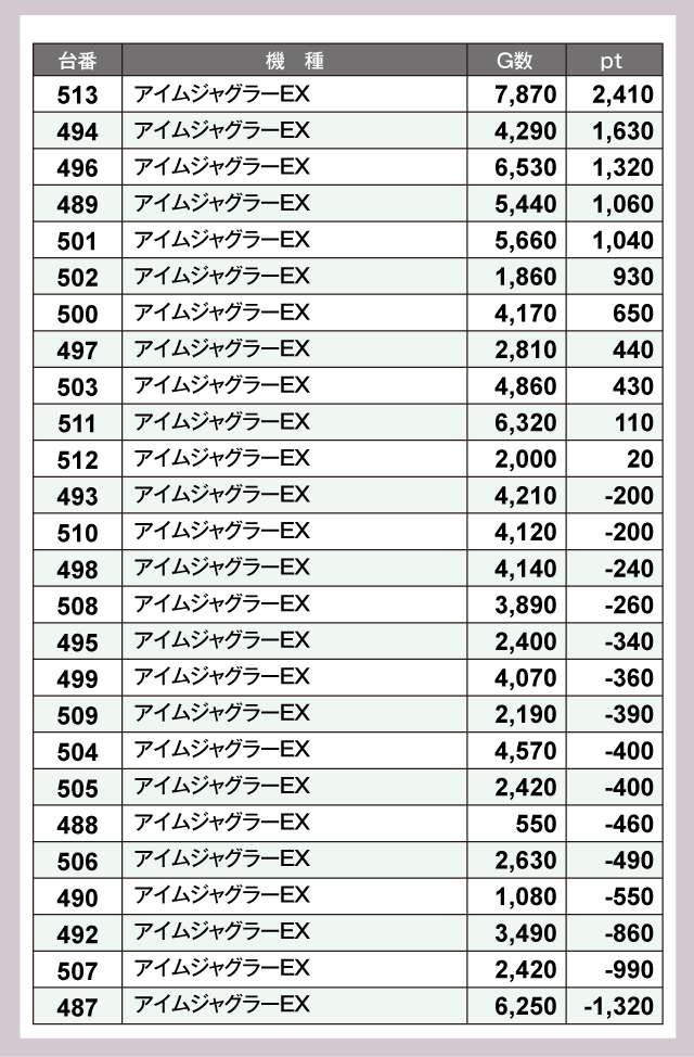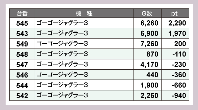 『ゴーゴージャグラー3』は8台中3台がプラス。いずれも稼働が高い台が結果を出している。