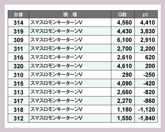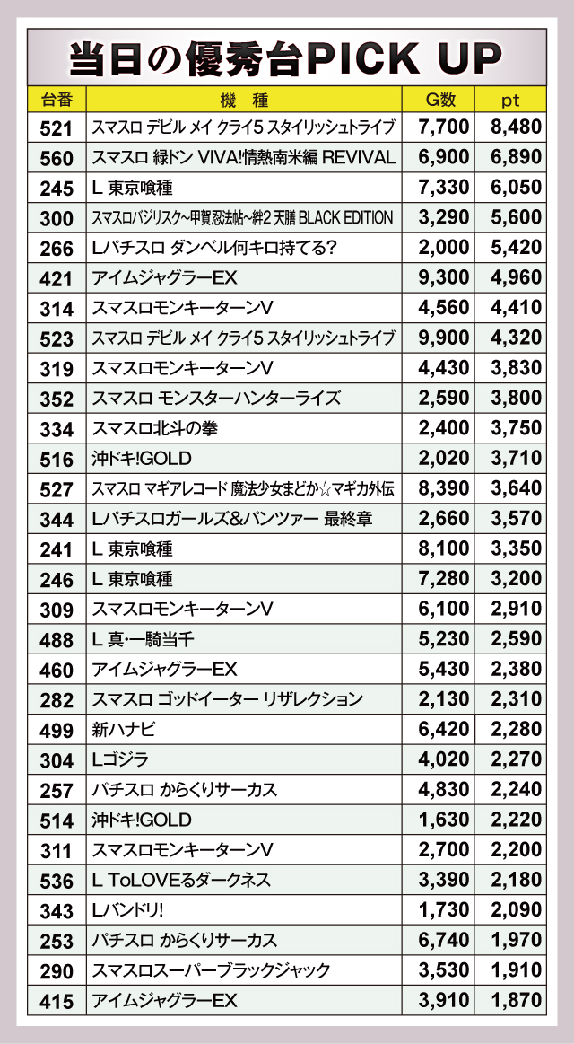 『スマスロ デビル メイ クライ5 スタイリッシュトライブ』521番台が+8,480ptと最も輝きを放ってた。そして『スマスロ 緑ドン VIVA!情熱南米編 REVIVAL』560番台が+6,890pt、『L 東京喰種』245番台が+6,050ptとつづく。以下にも『スマスロバジリスク~甲賀忍法帖~絆2 天膳 BLACK EDITION』300番台の+5,600ptなど、優秀台が多数誕生しているのが確認できた。