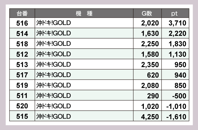 同じく人気の『沖ドキ!GOLD』は10台中7台がプラスで、存在感を示している。