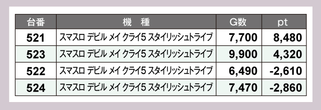 『スマスロ デビル メイ クライ5 スタイリッシュトライブ』は4台のうち半数がプラスになっていて、とくに521番台が8,000ptオーバーの大活躍だった。