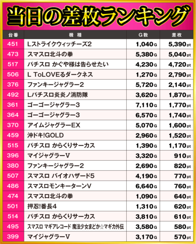この日は、『Lストライクウィッチーズ2』と『スマスロ北斗の拳』の+5,000pt超をはじめ人気のスマスロから多数のハイスコアが確認された。さらに、ジャグラーシリーズも大奮闘しており、差枚TOP20に7台がランクインする盛況ぶりを見せている。