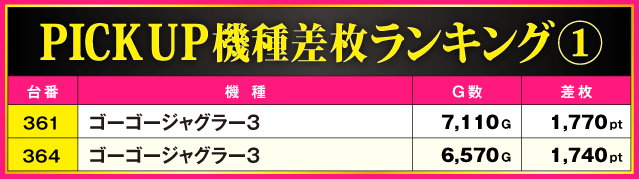 今回のPICK UP機種は『ゴーゴージャグラー3』で、361番台が+1,770pt、364番台が+1,740ptを記録。Aタイプならではの安定感を披露しファンを喜ばせていたのが非常に印象的であった。