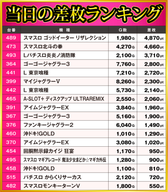 この日は、『スマスロ ゴッドイーター リザレクション』と『スマスロ北斗の拳』で+4,000pt超、『Lパチスロ炎炎ノ消防隊』で+3,710pt超など、人気のスマスロを中心に好成績が続出していた。さらに、ジャグラーシリーズも奮闘しており、ランキングに6台がランクインする盛況ぶりを見せている。