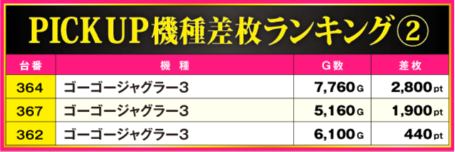 続いてPICK UP機種の状況を見ていこう。2台設置されている『L 東京喰種』は、どちらも+2,000pt超を記録。また、『ゴーゴージャグラー3』からは+2,800ptが発生している。そして、両機種合わせた全5台が全てプラス差枚で実戦を終えているだけに、ファンにとって充実の一日となったのは間違いないだろう。