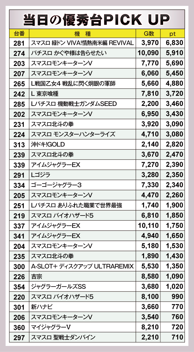 『スマスロ 緑ドン VIVA!情熱南米編 REVIVAL』281番台が+6,830ptと、そのポテンシャルを如何なく発揮していた。1万回転を超えた『パチスロ かぐや様は告らせたい』274番台は、+5,910ptとプレイヤーの期待に応えている。ほかにも『スマスロモンキーターンV』203番台が+5,690pt、207番台が+5,450ptなどなど、見応えのあるデータを披露してくれている。