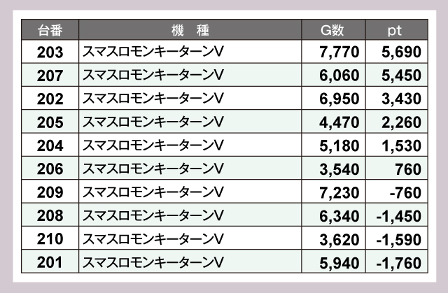 今回は人気機種の『スマスロモンキーターンV』をピックアップ。10台中6台がプラスptになっていて、G数も十分に回されている台が多く、同店での人気を裏付けていた。