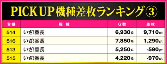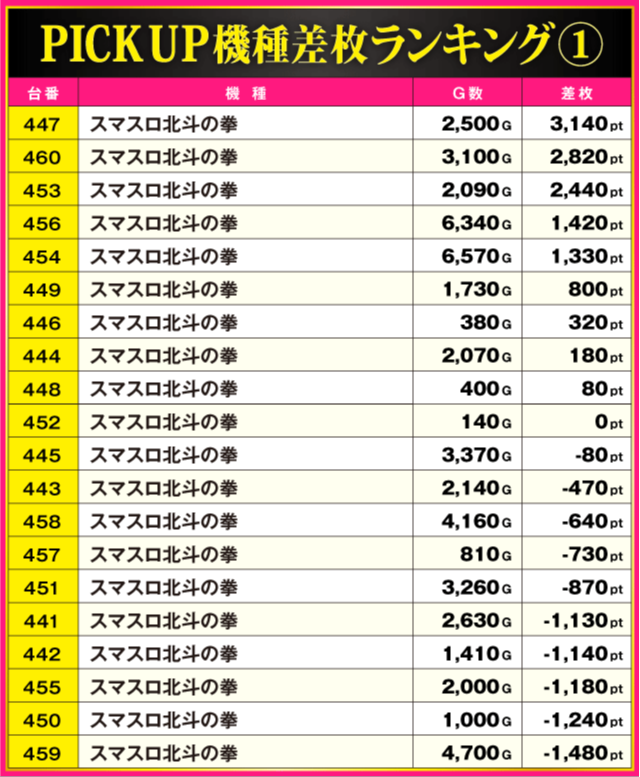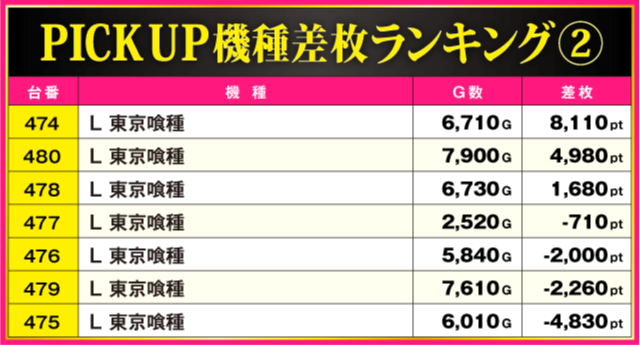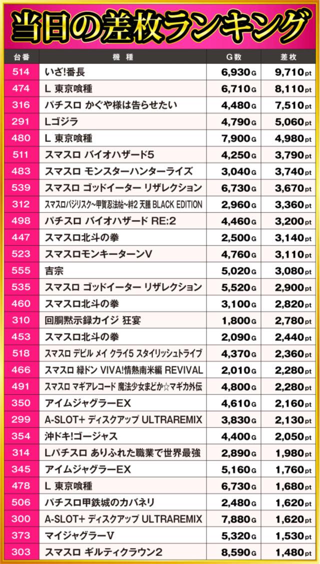 当日の差枚ランキング
