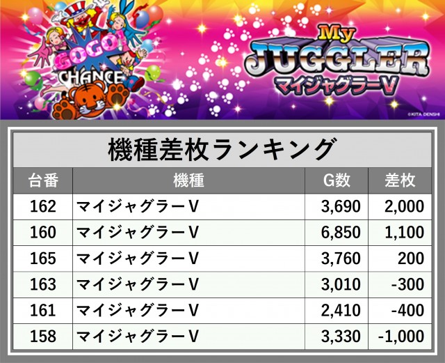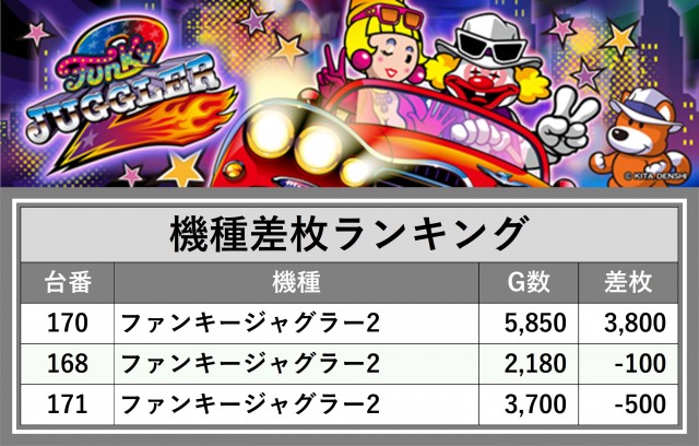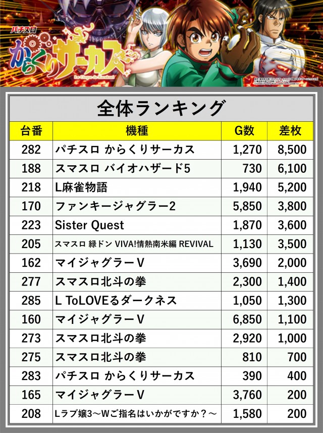厳選された取材対象機種をはじめ、その他スロット全体から好記録が飛び出した!プレイヤーが楽しんだ1日を下記データにて振り返ってみて欲しい。