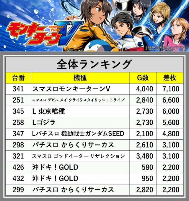 厳選された取材対象機種をはじめ、その他スロット全体から好記録が飛び出した!プレイヤーが楽しんだ1日を下記データにて振り返ってみて欲しい。