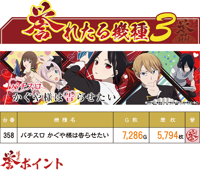 3位には『パチスロ かぐや様は告らせたい』がランクインを果たし、TOP3記録を1台設置機種が独占することに。1台設置だからと侮るなかれ!