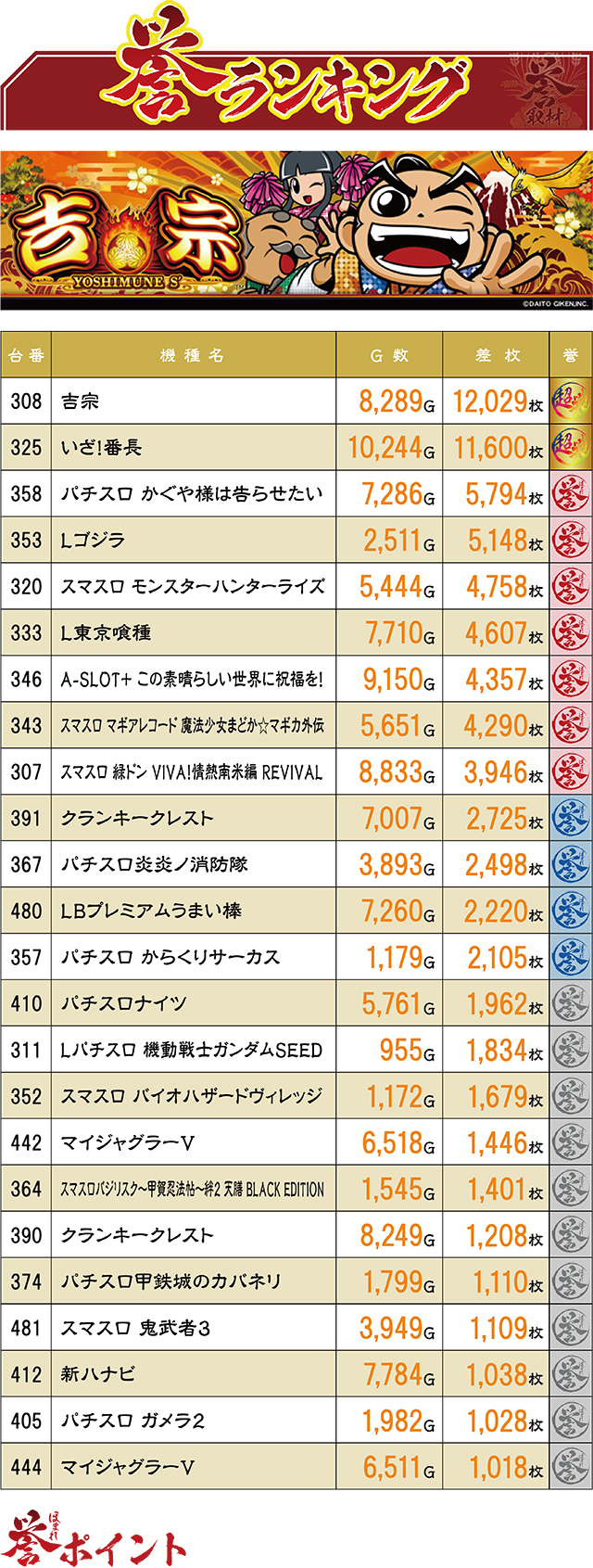 大都コンビからそれぞれ10,000枚オーバーが誕生したこの日。もしやこの日は大都マシンが主役?と思いきや、『Lゴジラ』や『A-SLOT+ この素晴らしい世界に祝福を!』『LBプレムアムうまい棒』などの1台設置機種も上位にランクインしていた。