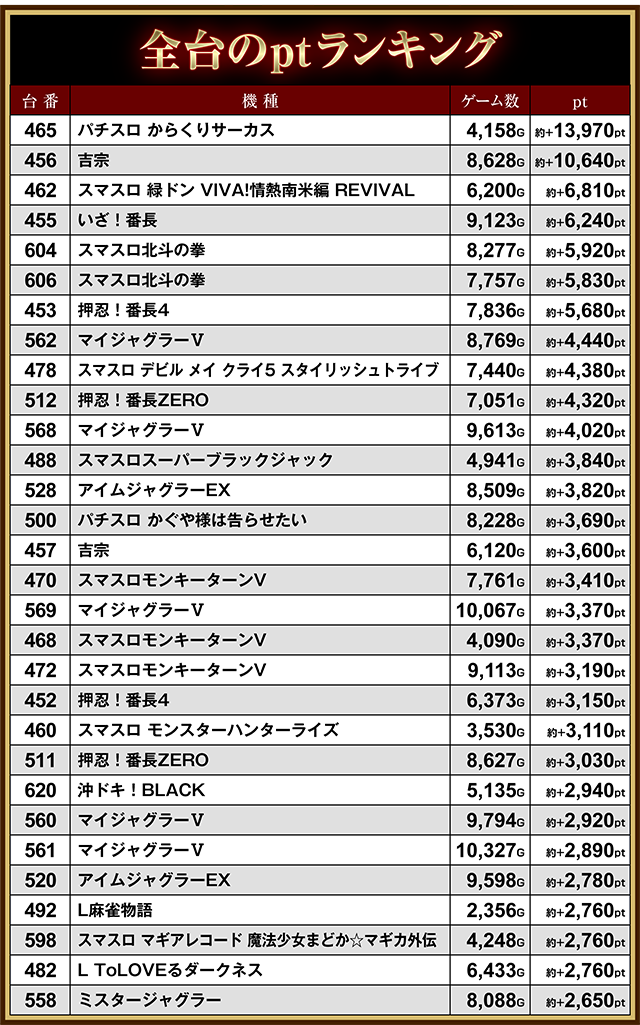 ほかにも、「ゴーゴージャグラー3」の391番台が約+3,290pt、「アイムジャグラーEX」の389番台もプラスとなった。