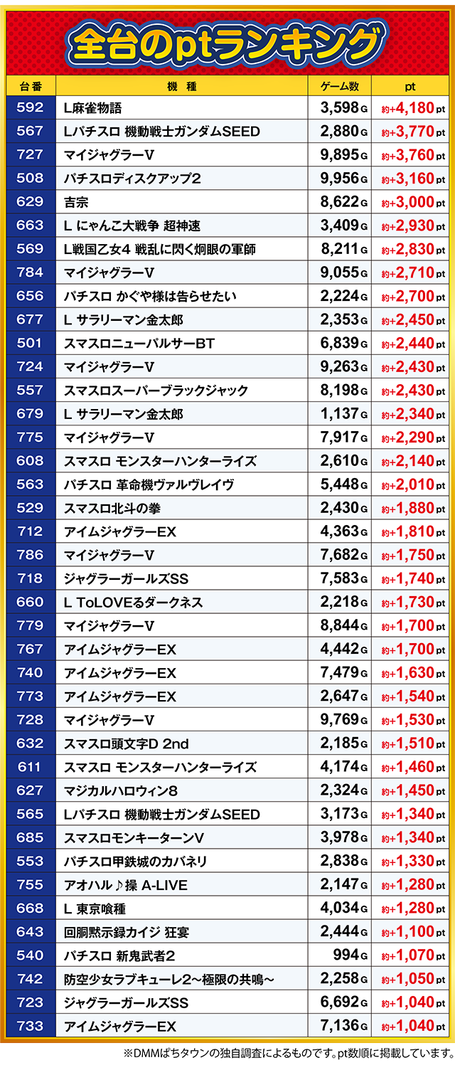 2台が約+1,300ptを超えた「Lパチスロ 機動戦士ガンダムSEED」は、567番台が約+3,700ptを上回った。
