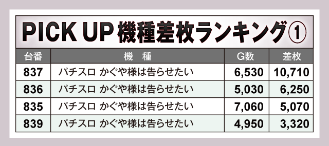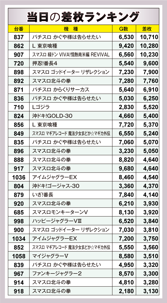 この日、最もプレイヤーの注目を集めたのが『パチスロ かぐや様は告らせたい』で、837番台+10,710枚を叩き出しランキングトップに輝いた。さらに『L 東京喰種』と『スマスロ 緑ドン VIVA!情熱南米編 REVIVAL』も万枚超を達成する盛況ぶりを見せているだけに、店内は常に熱気に包まれる一日となった。