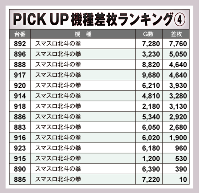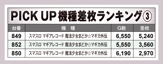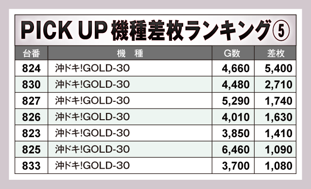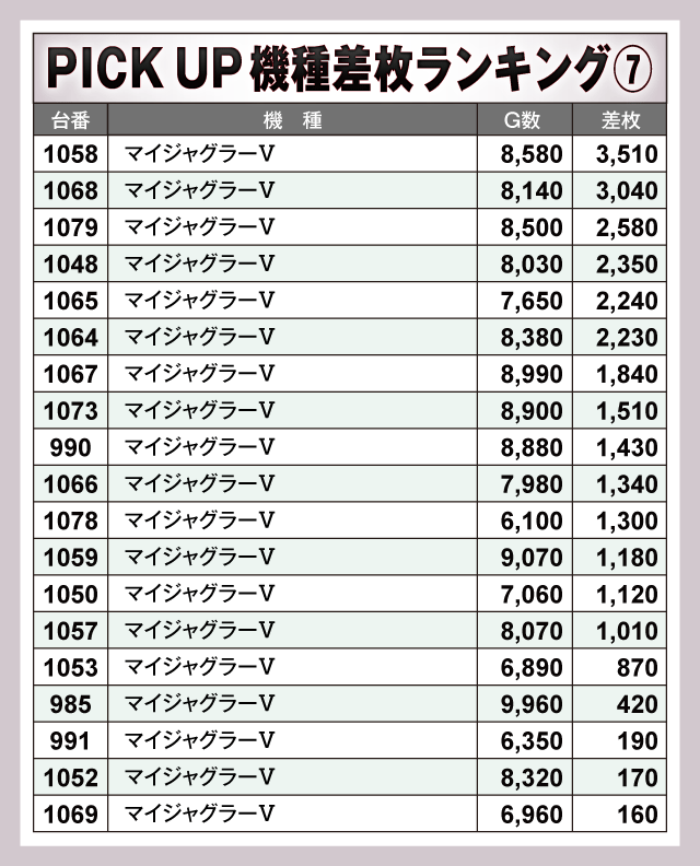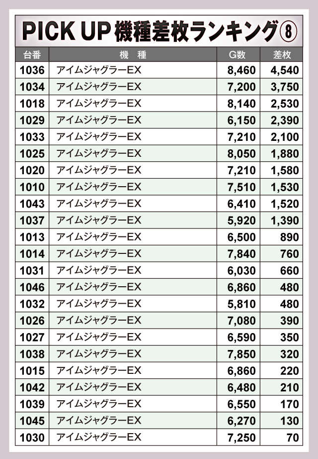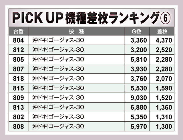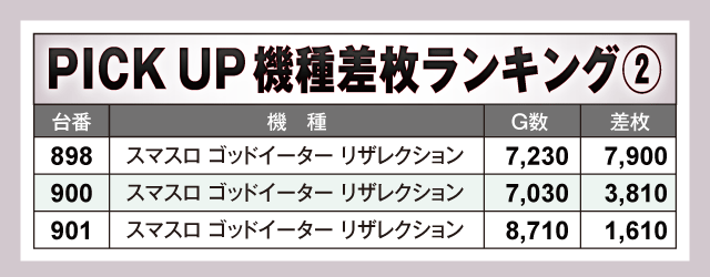 次にPICK UP機種の状況を見ていこう。ランキング上位機種以外からも多数の好調台を確認。そんな中、『スマスロ北斗の拳』と『スマスロ ゴッドイーター リザレクション』が+7,000枚超を記録している。また、看板機種のジャグラーシリーズをはじめ、その他の機種も軒並み半数以上の台がプラス差枚となる見事な結果を残しファンを喜ばせていた。