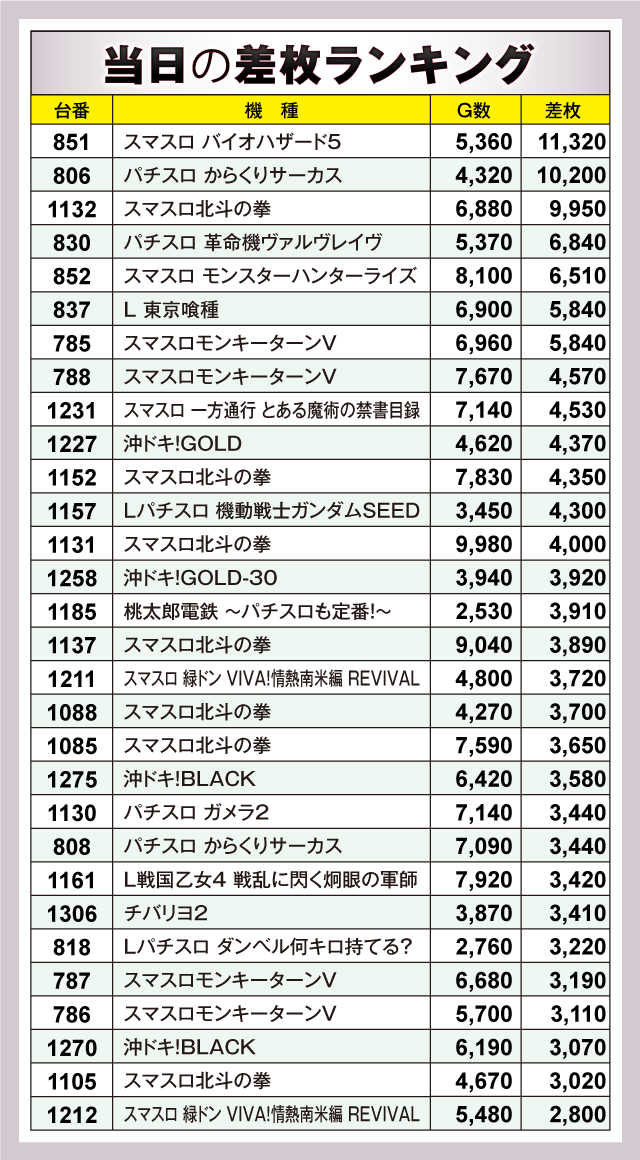 この日、最もプレイヤーの注目を集めたのが『スマスロ バイオハザード5』で、851番台が+11,320枚を叩き出しランキングトップに。また、『パチスロ からくりサーカス』も万枚超を達成、『スマスロ北斗の拳』からは万枚目前の+9,950枚が飛び出す盛況ぶりを見せていた。