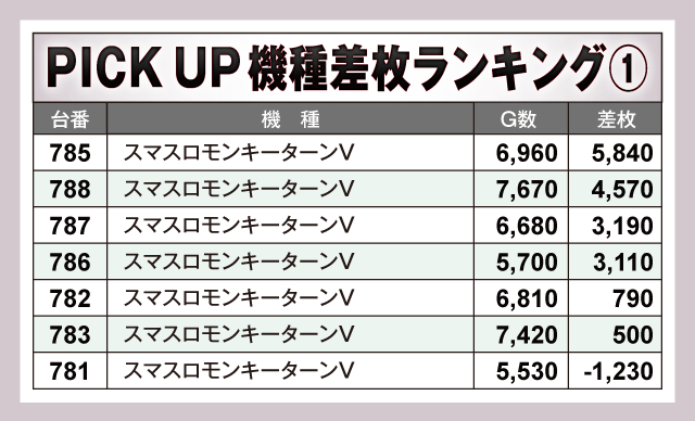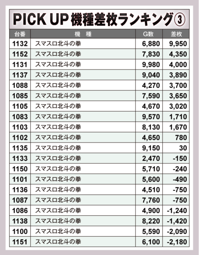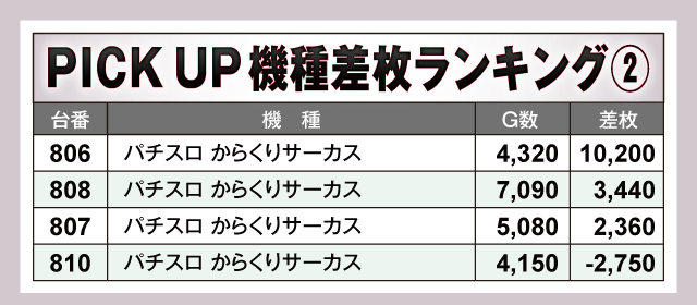 次にPICK UP機種の状況を見ていこう。『スマスロモンキーターンV』からは+5,840枚に+4,570枚といったハイスコアを確認。また、『パチスロ からくりサーカス』と『スマスロ北斗の拳』はランキング上位台以外にも+2,000枚超が大量発生しているだけに、ファンにとって充実の一日となったのは間違いないだろう。