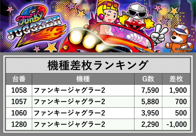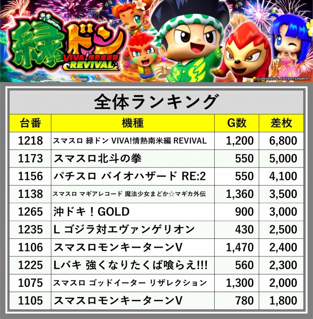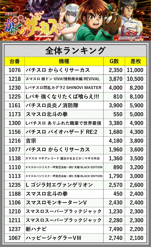 厳選された取材対象機種をはじめ、その他スロット全体から好記録が飛び出した!プレイヤーが楽しんだ1日を下記データにて振り返ってみて欲しい。