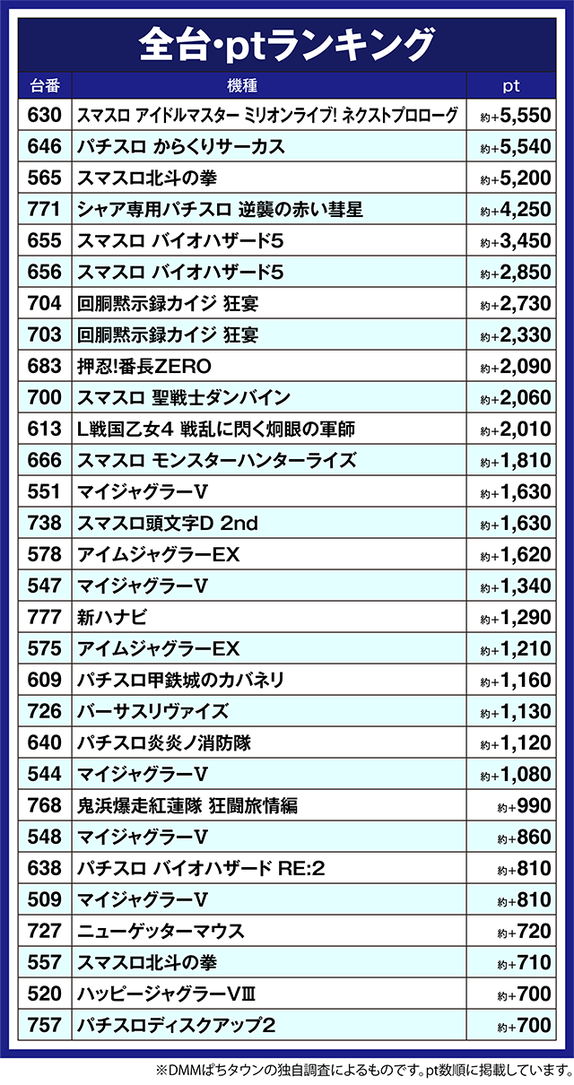 「パチスロ からくりサーカス」の646番台と「スマスロ北斗の拳」の565番台も約+5,200pt以上となった。