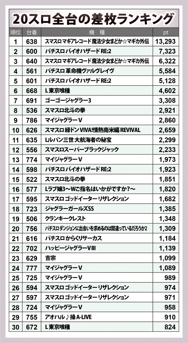 30台のうち24台が4桁以上のプラスを導き、+2,000枚以上は12台、+3,000枚以上は7台、+4,000枚以上は6台、+5,000枚オーバーは5台、+6,000枚オーバーは3台、+7,000枚オーバーは2台、そして万枚を奪取したのは1台と、前回・前々回の基準には及ばなかったが、それでも勝機がそこかしこにあったことが窺えた。