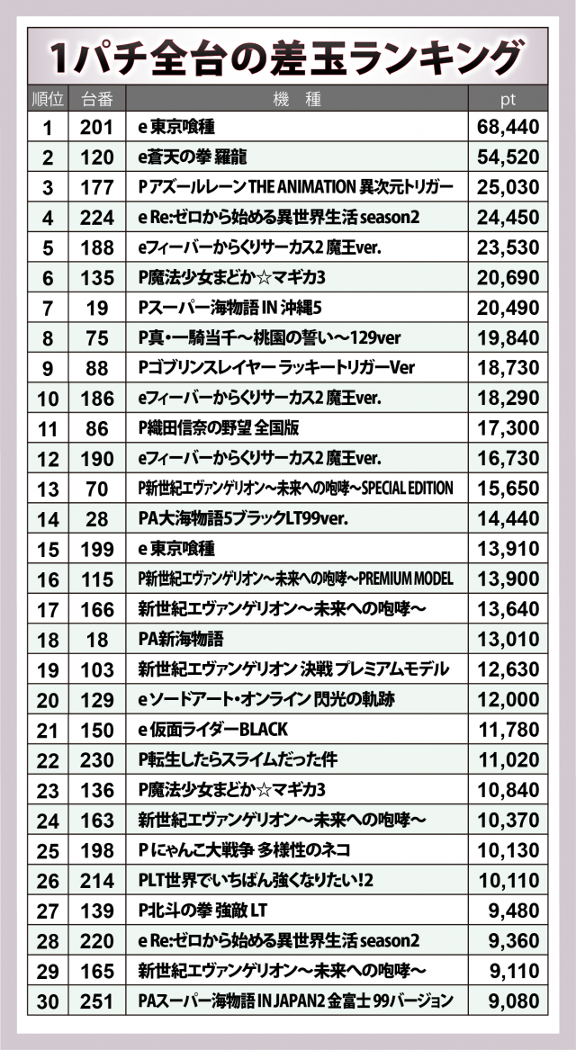 首位となったのが『e 東京喰種』201番台で+68,400個超のビッグヒット。さらに『e蒼天の拳 羅龍』では+54,500個超と、スマパチが両巨頭の任を果たした。