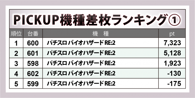 『パチスロ バイオハザード RE:2』5台は表の3台が勝利、+7,300枚超・+5,100枚超と、スマスロに負けない数値を叩き出した。