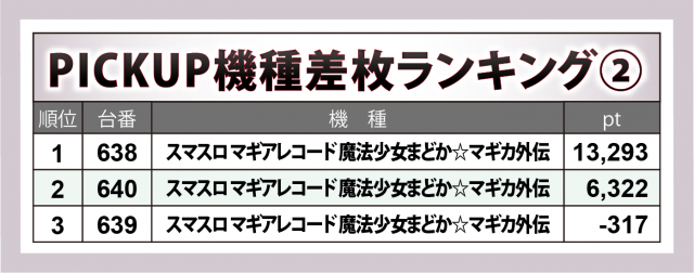 『スマスロ マギアレコード 魔法少女まどか☆マギカ外伝』では638番台が+13,300枚弱でこの日のナンバーワンに輝き、他にも+6,300枚超をカウントできた。
