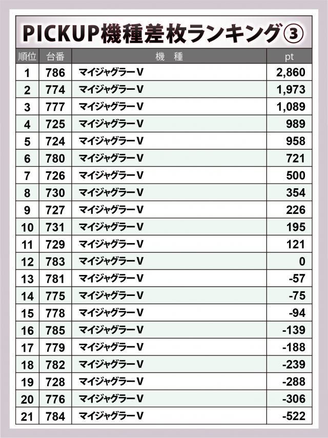『マイジャグラーⅤ』21台は半数近くがプラスを収め、3台が4桁プラスを成し遂げた。