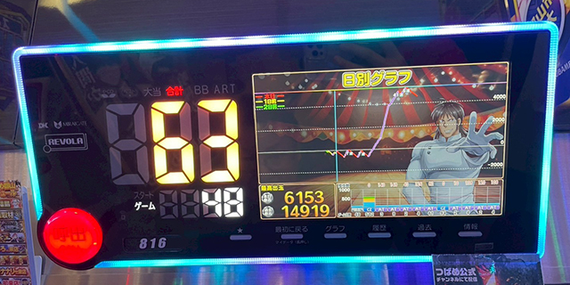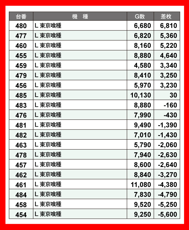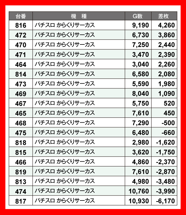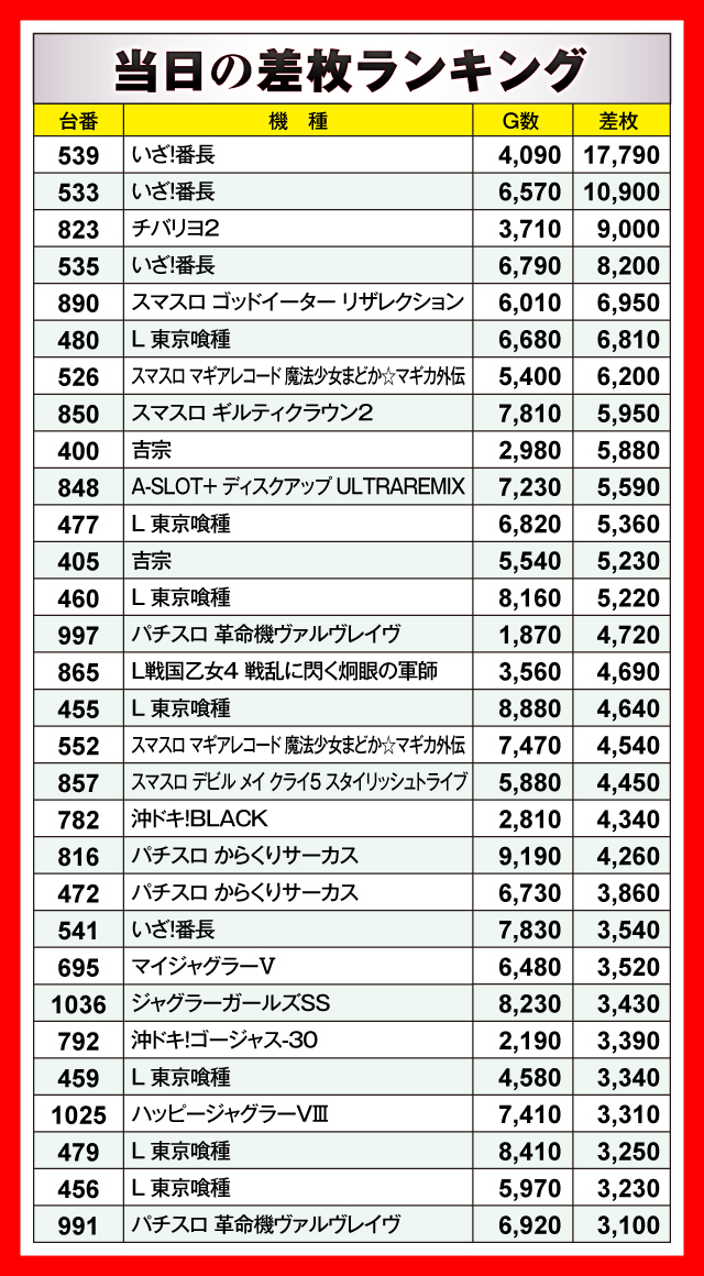 この日もっとも強い輝きを放っていたのが『いざ!番長』。539番台が脅威の+17,790枚、533番台が万枚突破の+10,900枚、535番台が+8,200枚などなど多数ランクインしている。他にも『チバリヨ2』823番台の+9,000枚や『スマスロ ゴッドイーター リザレクション』890番台の+6,950枚など、なんとも見応えのあるデータが並んでいた。