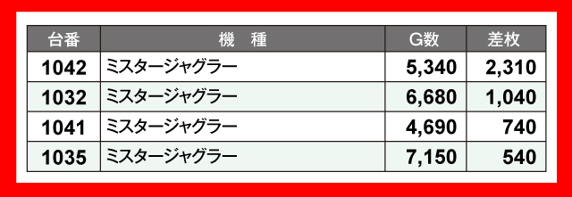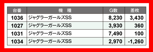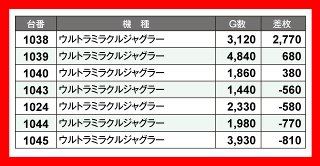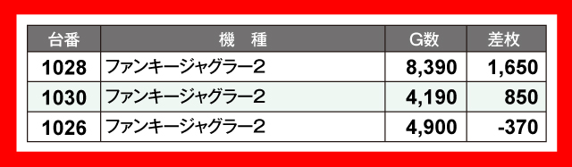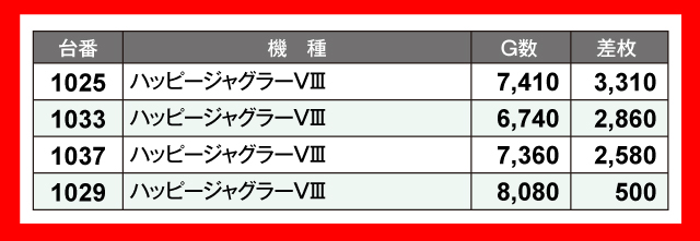 絶大な人気を誇る『ジャグラー』シリーズからは5機種をピックアップ。とくに『ハッピージャグラーVⅢ』と『ミスタージャグラー』は全台がプラス差枚となっていて、安定した実力を発揮していた。