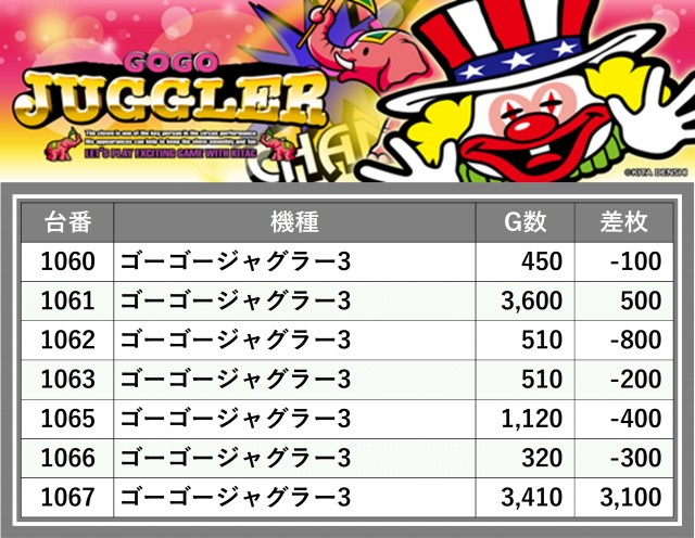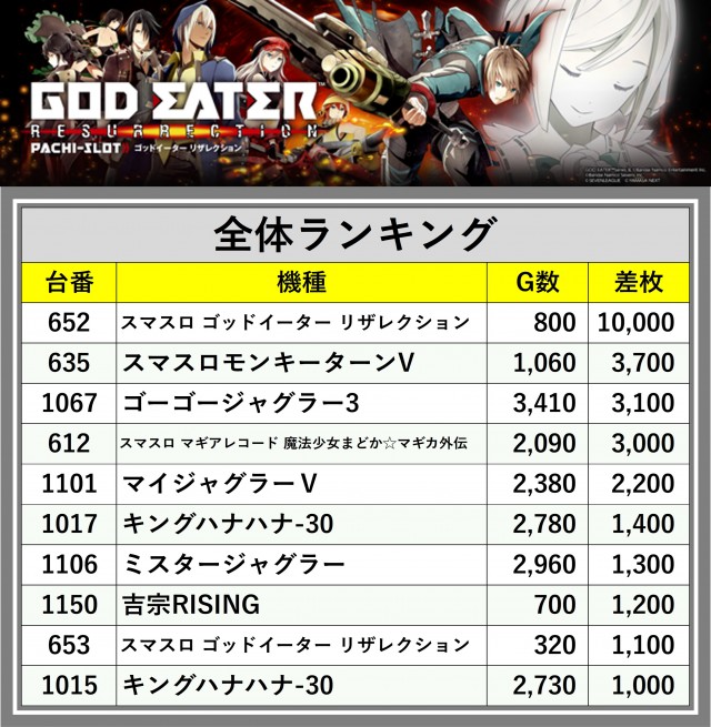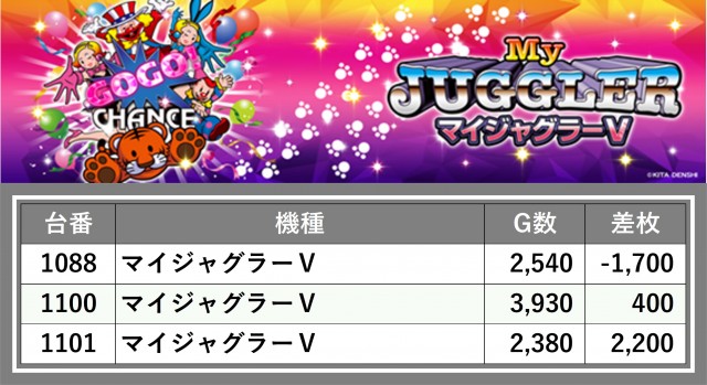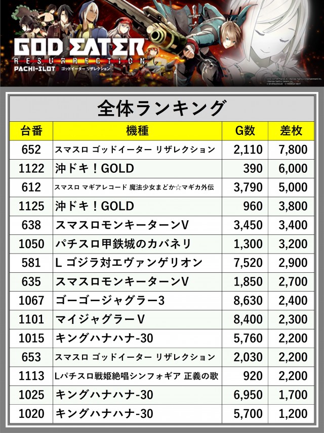 厳選された取材対象機種をはじめ、その他スロット全体から好記録が飛び出した!プレイヤーが楽しんだ1日を下記データにて振り返ってみて欲しい。